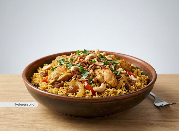 Medium. Serveras med smörstekt saffransris kokt ihop med kyckling, russin, lök, paprika, kryddor, rostad lök, koriander och cashewnötter