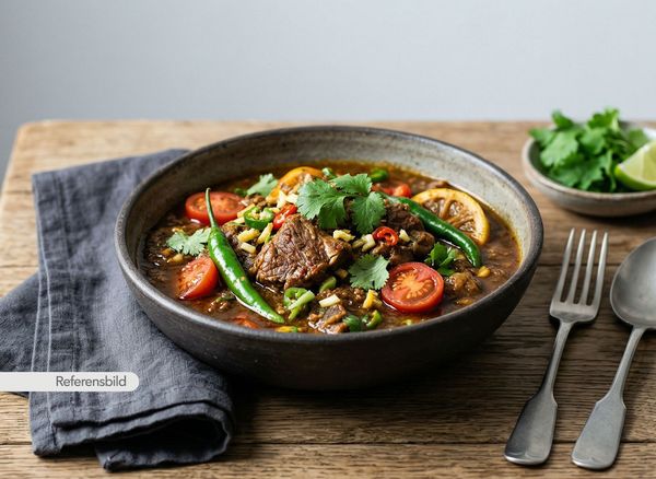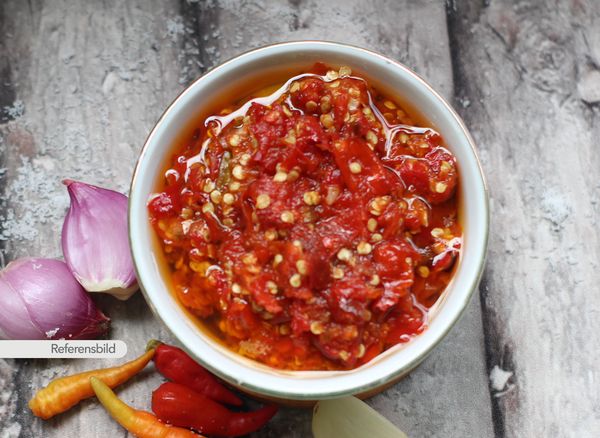Serveras med gryta med färsk grön chili, tomater, ingefära, vitlök, koriander och citron som är tillagad i special sambalsås stark och sur