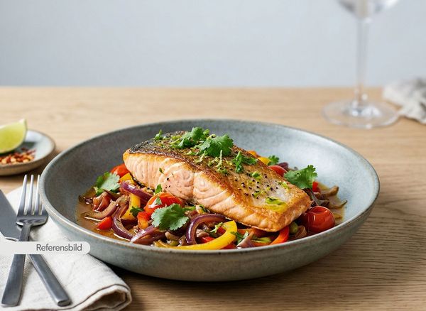Serveras med smörstekt lax, lök, paprika, färsk koriander och tomat i specialsås