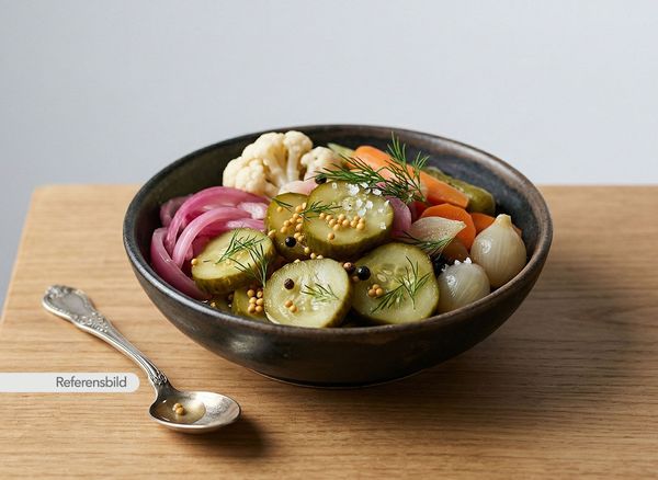 Serveras med inlagda grönsaker