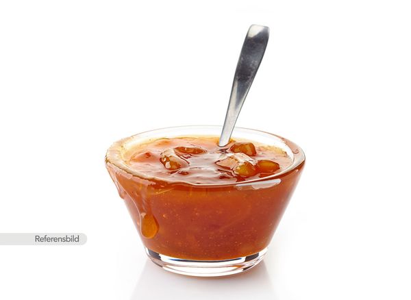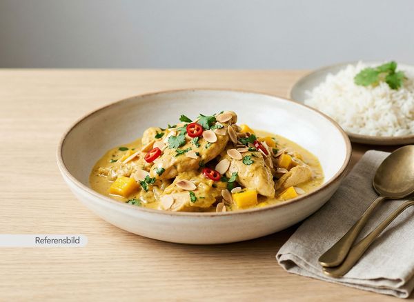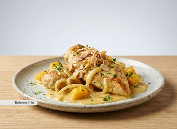 Mild och söt. Serveras med kycklingfilé med smör, lök, mango, grädde och mandel