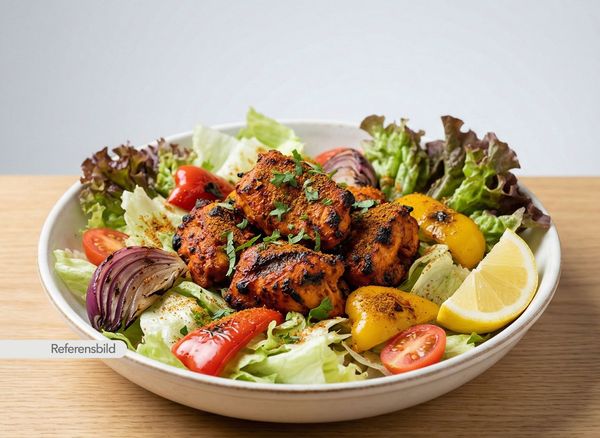 Serveras med grillad lök, tomat, paprika med isbergssallad, citron och tandoori masala
