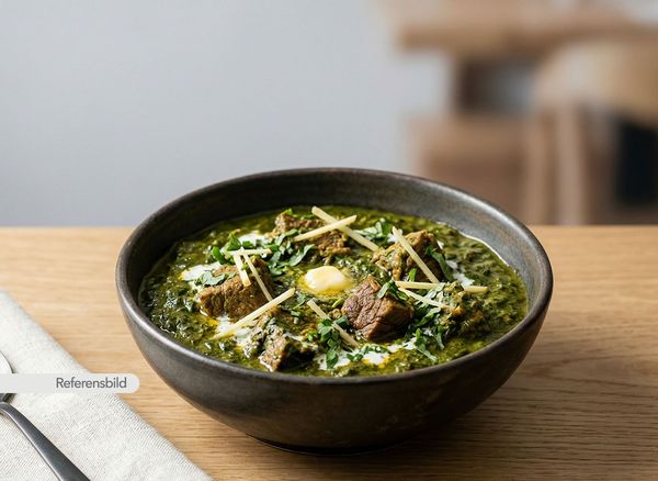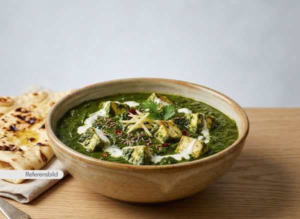 Medium. Serveras med gryta med spenat, färsk grön chili, Indiskt smör, grädde och kryddor