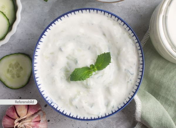 Serveras med kall Indisk yoghurtsås med riven gurka samt, mynta och kryddor