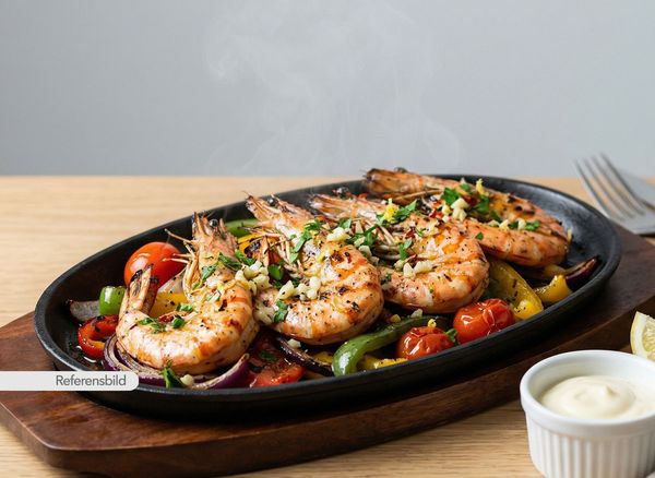 Serveras med vitlöks marinerade och grillade jätteräkor