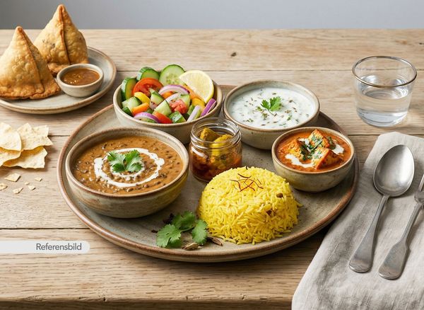 Serveras med paneer tikka masala, dal makhani med saffransris, sallad, papadam, raita, pickles och vegetarisk samosa