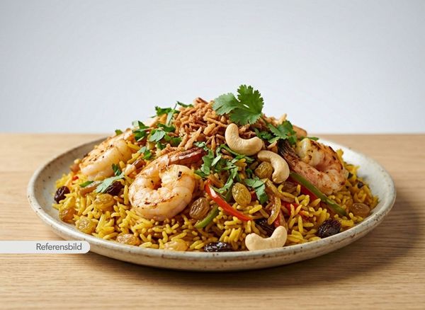 Medium. Serveras med smörstekt saffransris kokt ihop med jätteräkor, russin, lök, paprika, kryddor, rostad lök, koriander och cashewnötter