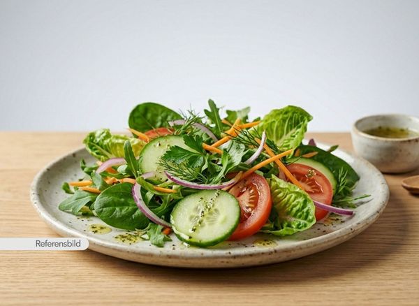 Serveras med färsk gurka, tomat, lök, morot och färska örter
