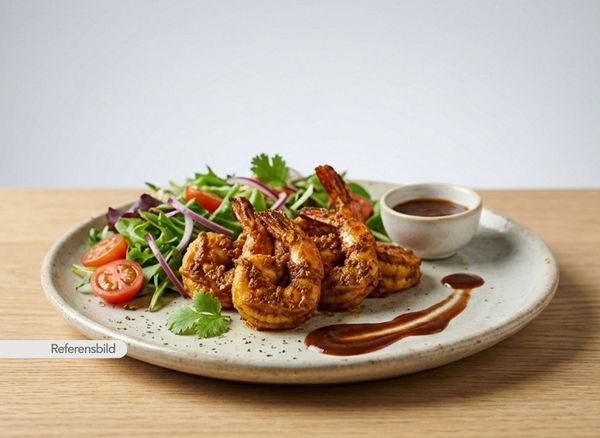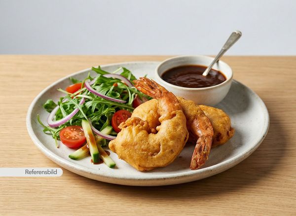 Marinerad och friterad jätteräkor. Serveras med sallad och tamarind chutney