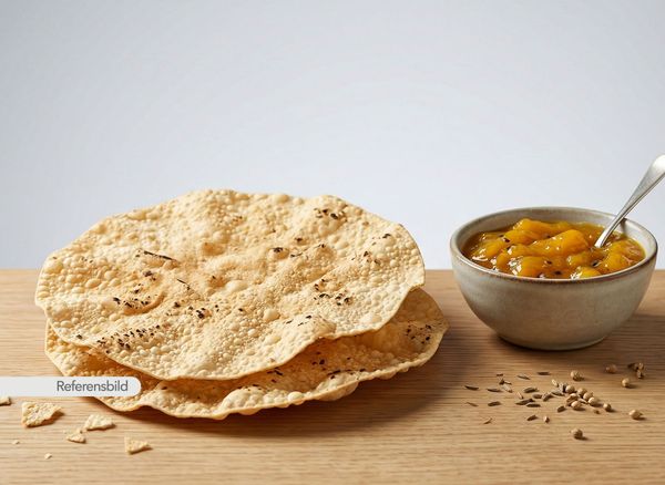 Tunt, krispigt bröd gjort av ris och linsmjöl. Serveras med mango chutney