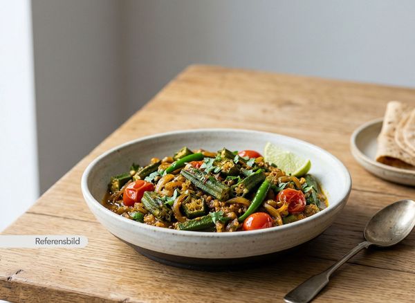 Vegansk. Serveras med okra, lök, färsk grön chili och tomat med Indiska kryddor