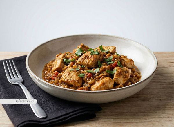 Medium. Serveras med kycklingfilébitar med vitlök, lök, tomat och masalasås