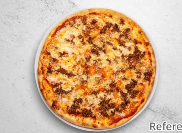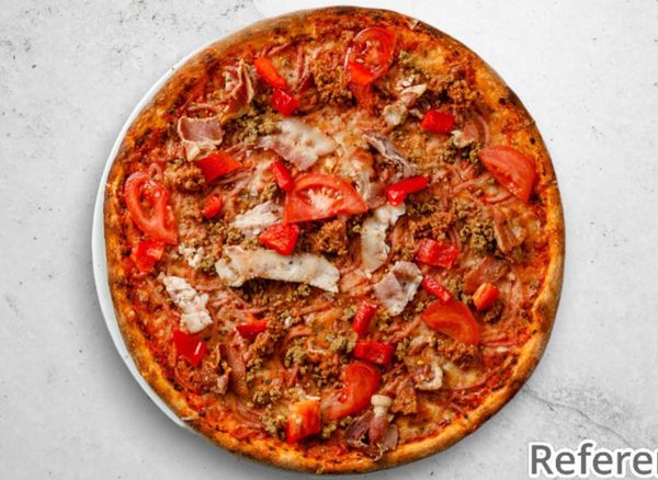 Pizza with tomato sauce, cheese, bacon, minced meat, fresh garlic, onions and mushrooms.