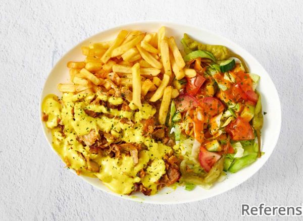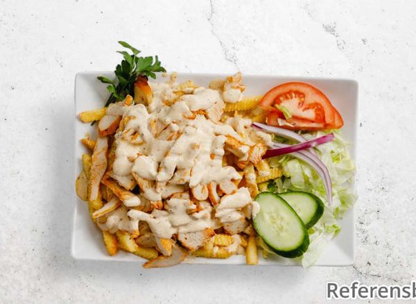 Served with kebab, fries, iceberg lettuce, tomato, cucumber and onion.