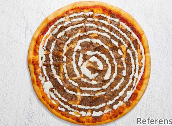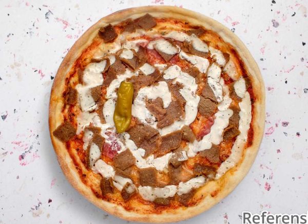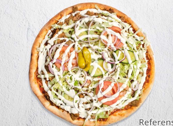 Pizza with tomato sauce, cheese, kebab, fresh tomatoes, cucumber, onion and iceberg lettuce.