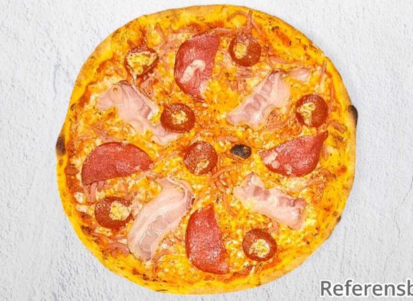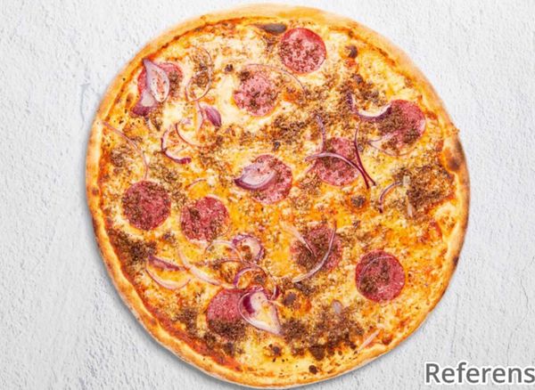 Pizza with tomato sauce, cheese, minced meat, salami and pepperoni.