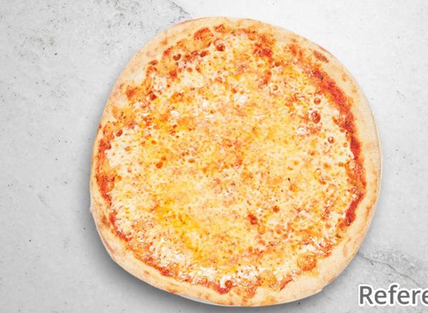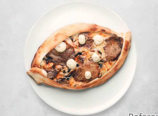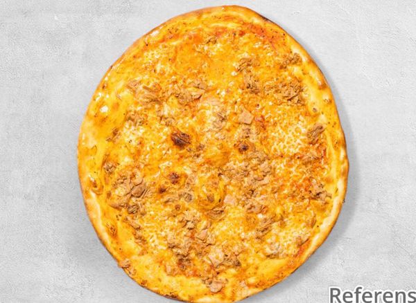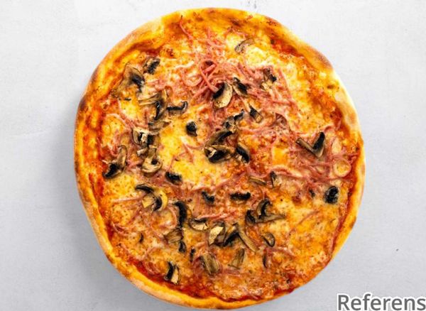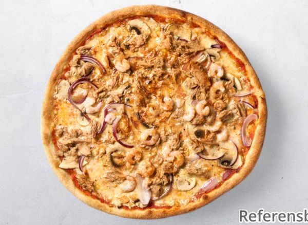 Pizza with tomato sauce, cheese, beef fillet, prawns, mushrooms and bearnaise sauce.