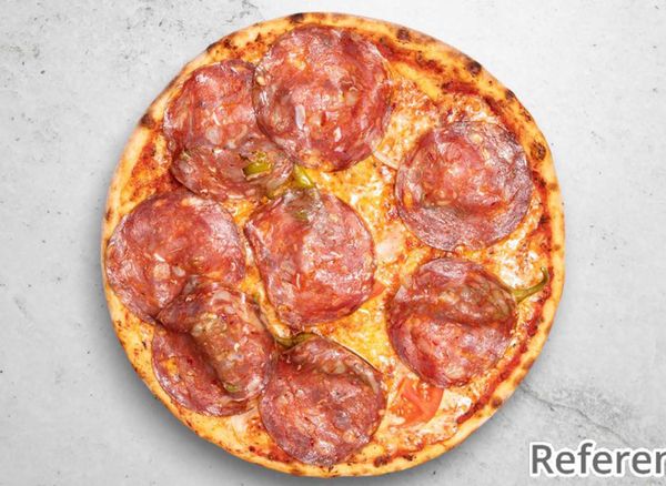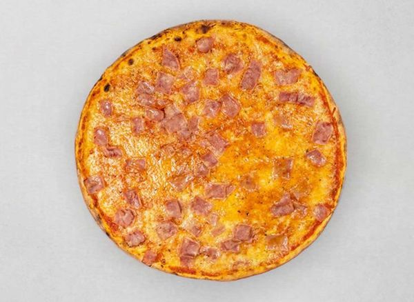 Pizza with tomato sauce, cheese, ham, salami and piri piri seasoning.