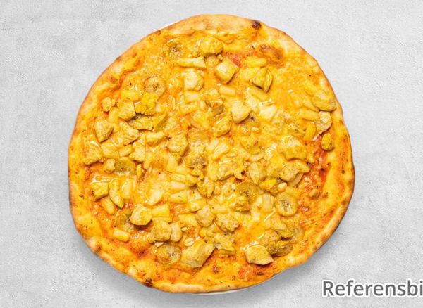 Pizza with tomato sauce, cheese, chicken, banana, pineapple and curry.