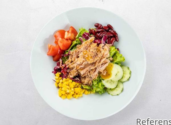 Salad with iceberg lettuce, tomato, cucumber, onion, tuna, lemon, olives and paprika.