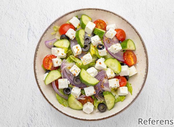 Salad with iceberg lettuce, tomato, cucumber, onion, paprika, olives, corn and salad cheese.