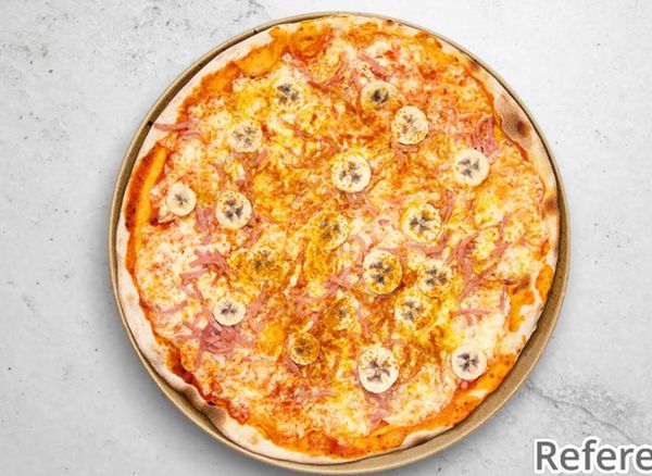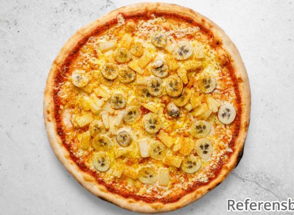 Pizza with tomato sauce, cheese, prawns, ham, banana, pineapple, peanuts and curry.