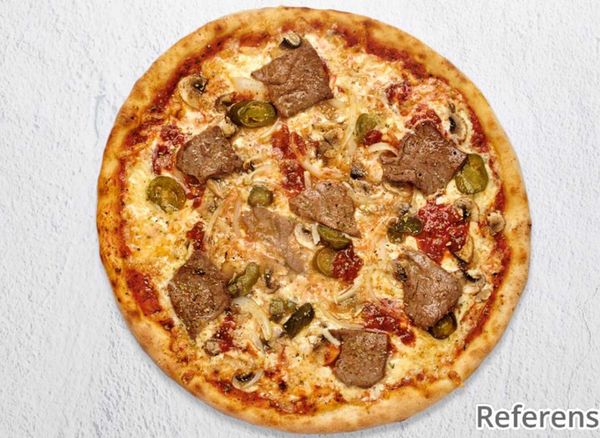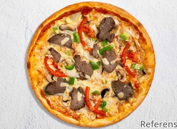 Pizza with tomato sauce, cheese, beef fillet, gorgonzola, mushrooms, onion and garlic.