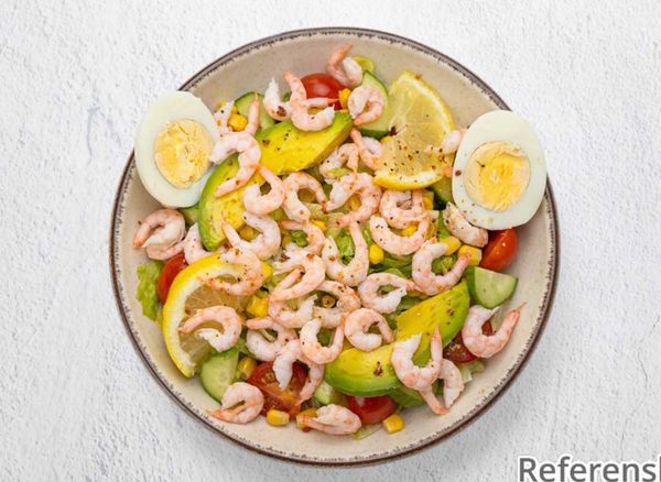 Salad with iceberg lettuce, tomato, cucumber, shrimp, lemon, corn and paprika.
