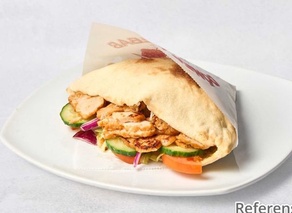 Served with kebab, iceberg lettuce, tomato, cucumber and onion.