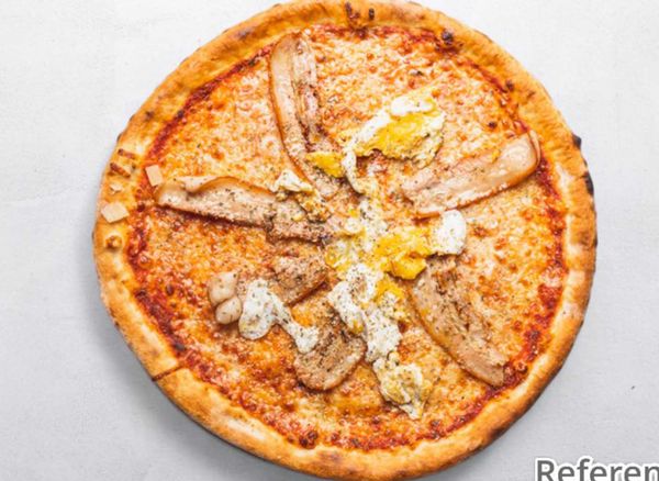 Pizza with tomato sauce, cheese, salami, bacon and egg.