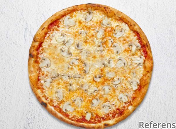 Pizza with tomato sauce, cheese and mushrooms.