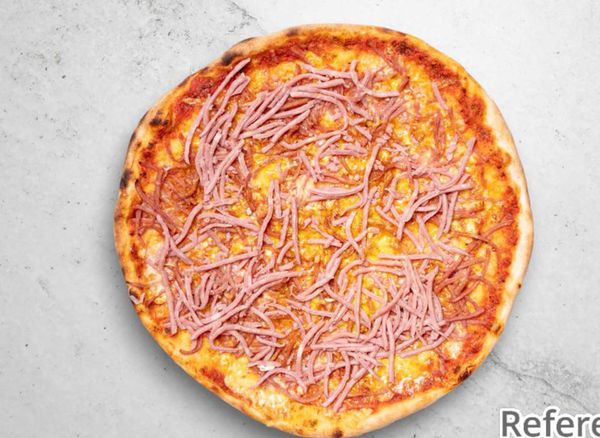 Pizza with tomato sauce, cheese, ham and minced meat.