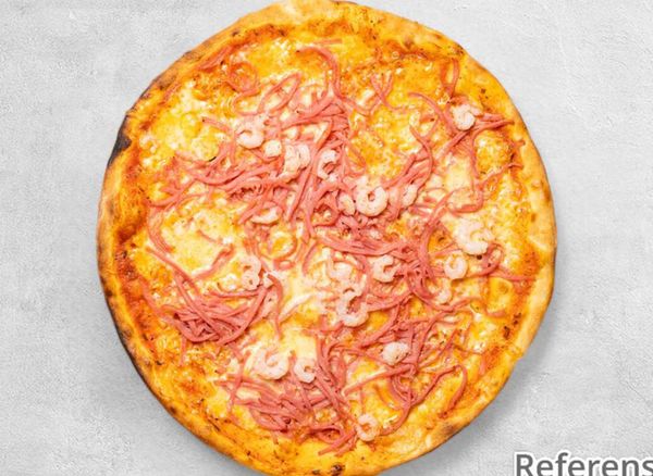 Pizza with tomato sauce, cheese, ham and prawns.