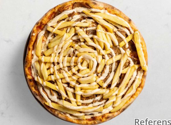 Pizza with tomato sauce, cheese, kebab and fries.