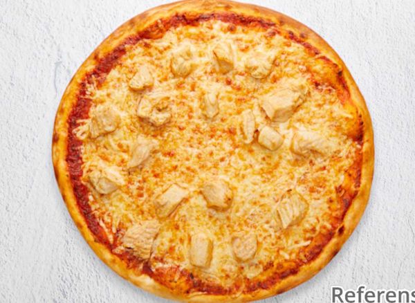 Pizza with tomato sauce, cheese, chicken, mushrooms and curry.