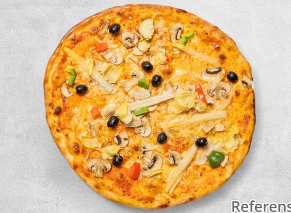 Pizza with tomato sauce, cheese, mushrooms, olives, onions, paprika and pepperoni.