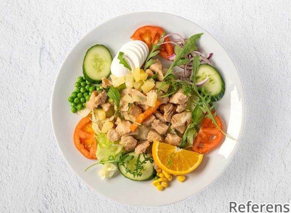 Salad with iceberg lettuce, tomato, cucumber, chicken, pineapple and corn.