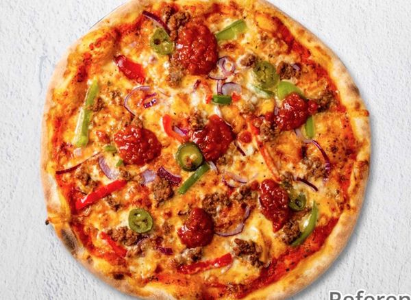 Pizza with tomato sauce, cheese, minced meat, onion, jalapeño and paprika.