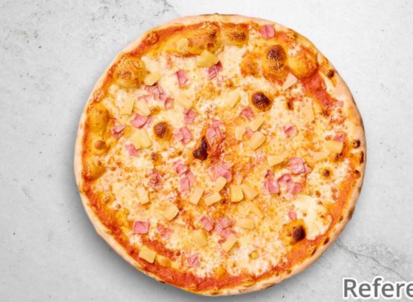 Pizza with tomato sauce, cheese, ham and pineapple.
