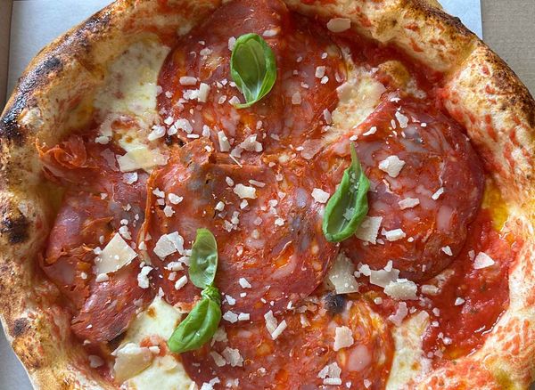 Pizza with san marzano tomato DOP, fior di latte DOP, nduja, salami, ventricina, basil, parmesan DOP and olive oil.