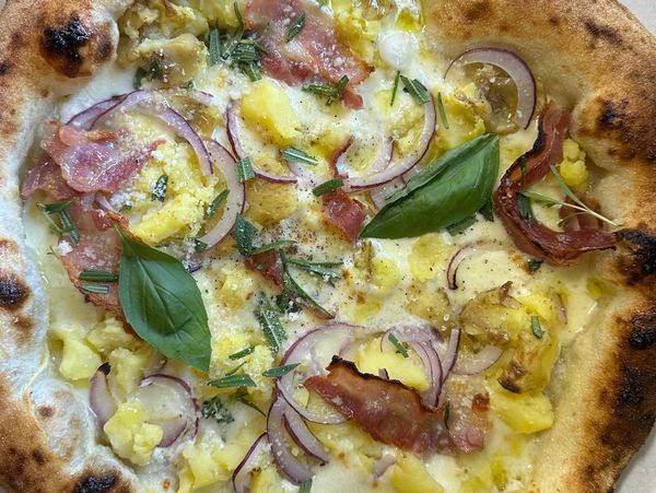 Nyhet. Pizza med creme fraîche, fior di latte, potatis, kalvbacon,Rosmarin, rödlök, Tryffelolja, ParmesanD.O.P, basilika