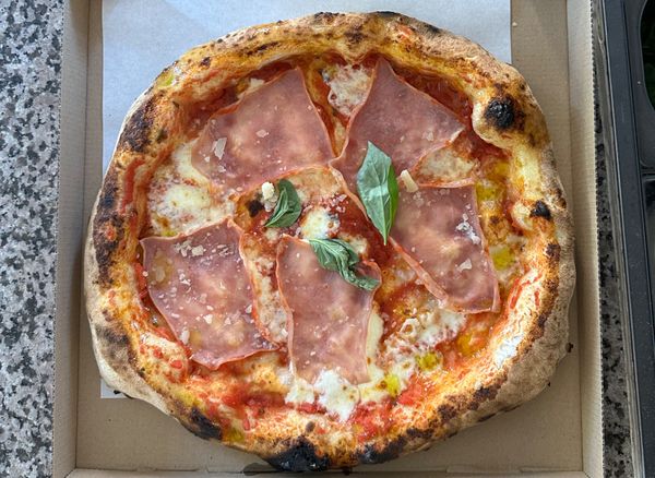 Pizza with San Marzano tomato DOP, fior di latte, prosciutto cotto, parmesan DOP, basil and olive oil.