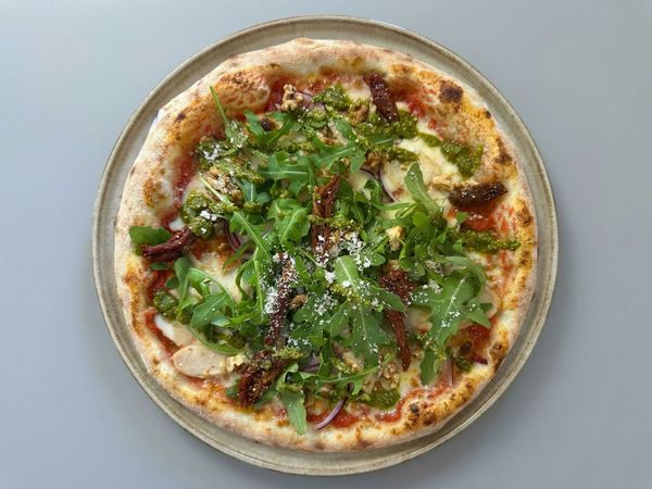San marzano tomat, Fior di latte Kycklingfilé, Soltorkad tomat, Pesto,pistagenötter Parmesan & Ruccola, olivolja