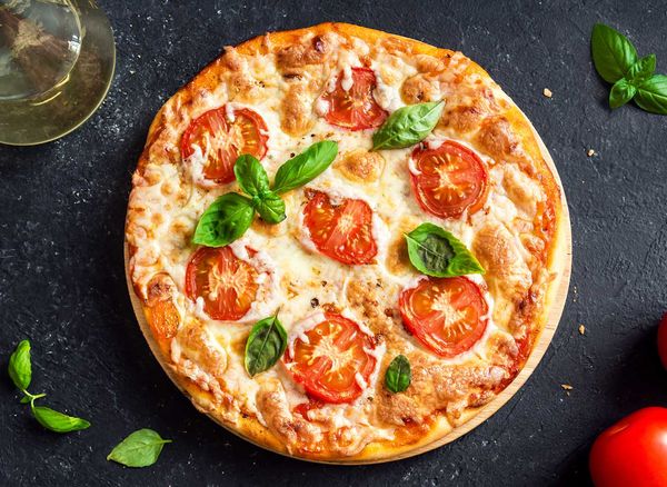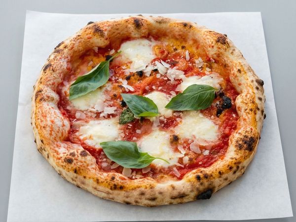 Pizza with san marzano tomato DOP, buffalo mozzarella, parmesan DOP, basil and olive oil.