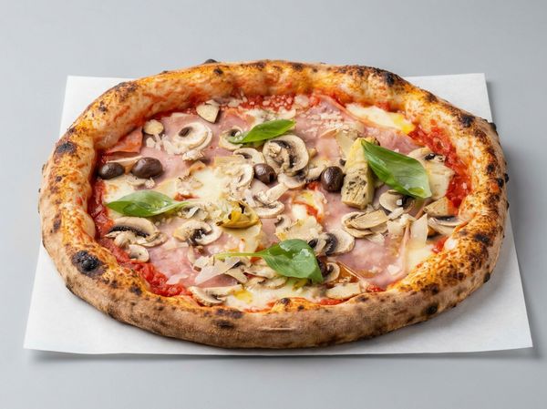 Pizza with san marzano tomato DOP, fior di latte, prosciutto cotto, mushrooms, artichoke, leccino olives, parmesan DOP, basil and olive oil.