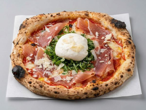 Pizza with san marzano tomato DOP, fior di latte, parma ham DOP, buratta, arugula, parmesan DOP, basil and olive oil.