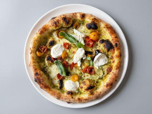 Pizza with fresh cream, fior di latte DOP, yellow, red semi-dried tomatoes, buffalo mozzarella, pesto, parmesan DOP and basil.