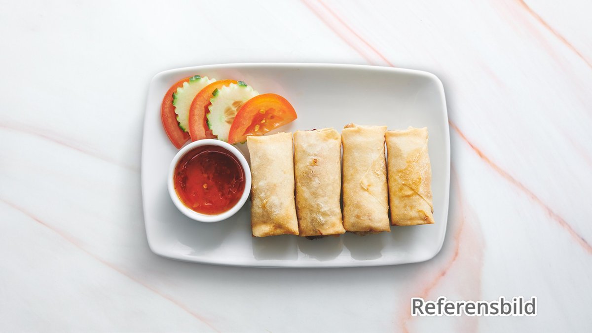 Friterad vårrulle med köttfärs och grönsaker, serveras med sweet chilisås. Tillval: Extra tillbehör