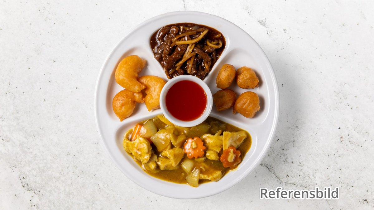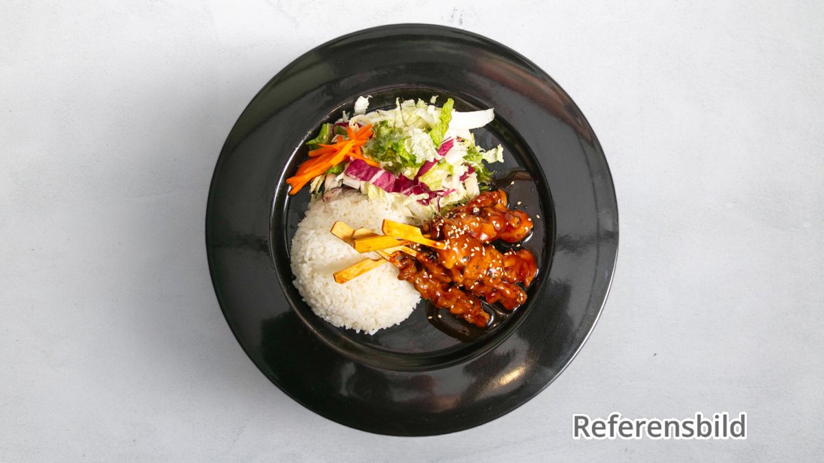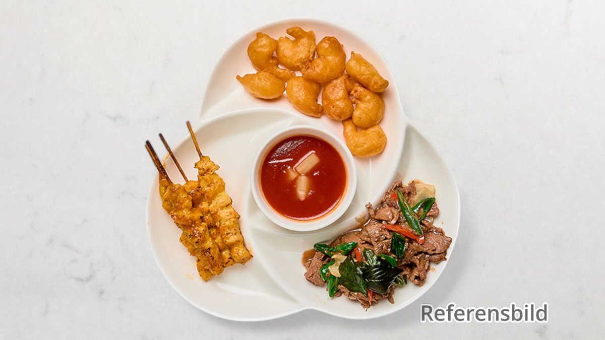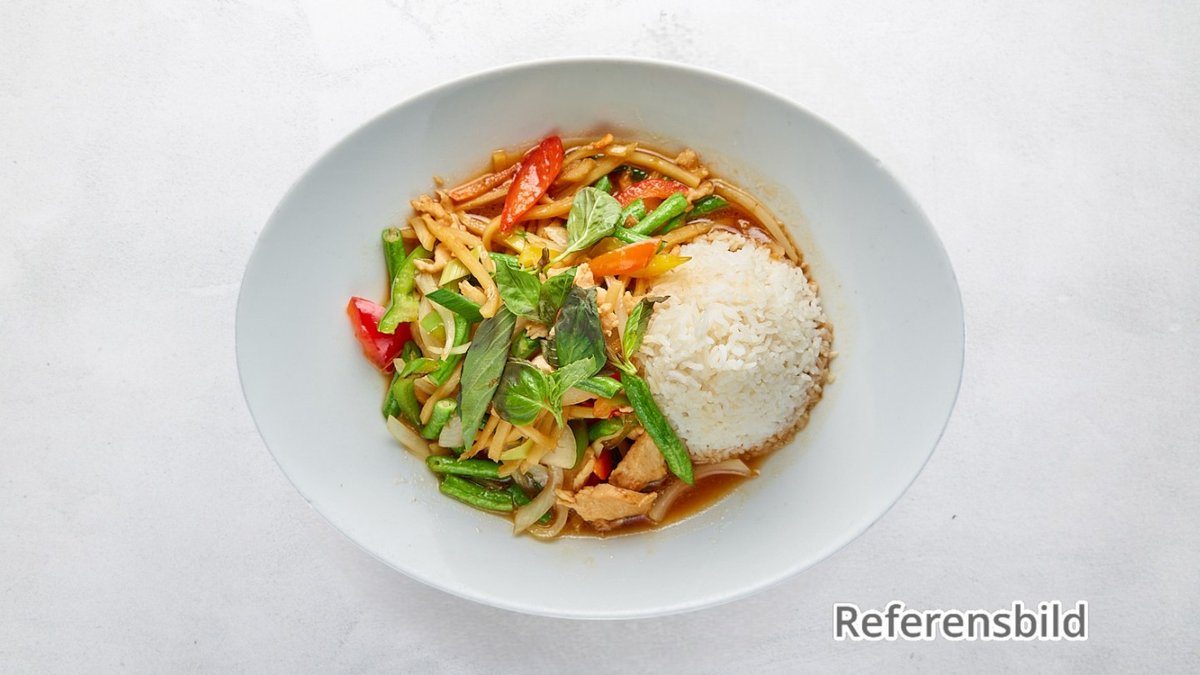 Välj mellan indisk currysås, ostronsås, schezwansås, röd kokossås, Pad Thaisås eller thaibasilikasås. Serveras med ris, stekt ris, nudlar eller stekta äggnuglar. Tillval: Sås, Extra tillbehör, Dryck