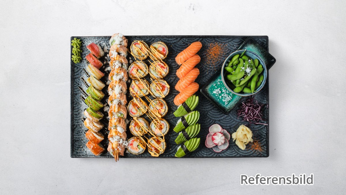 10 lax, 6 nilstilapia, 6 räkor, 4 gulfenad tonfisk, 4 avokado och 10 california rolls. Tillval: Extra tillbehör, Dryck